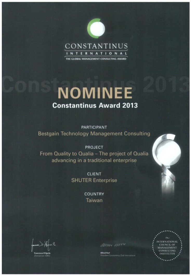 【國際管理顧問傑出案例—君士坦丁獎】該獎項每年評選一次,每次嚴格評選出10例最佳實踐案例,其中1個金獎,2個銀獎,7個優秀獎,是對全球各國家管理顧問成果在國際層面上的評價,也是各個國家展示管理顧問業最高水準的舞臺,對擴大各個國家管理顧問業的國際影響力具有重大作用,對推進全球管理顧問業的發展具有里程碑意義,本公司能在眾多國際優秀的管理顧問個案中獲得殊榮,是國際經營管理顧問協會理事會(ICMCI)的國際評審委員們對我們專業的肯定,亦是對本公司在管理/諮詢的能力水平上給予高度的評價。