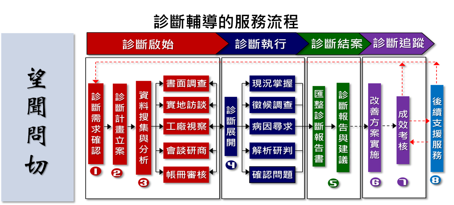 準備事項: (1)確認實地初訪時間、地點、參與人員(2)溝通診斷項目需求及目標(3)企業基本資料提供
